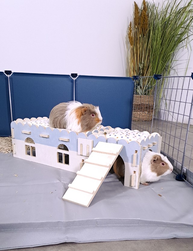 Parfaitement adaptées à l’univers de Neopark ! Avec leur teinte bleu doux assortie à celle du cochon d'inde de Neopark, elles s’intègrent harmonieusement à votre décor. Deux modèles sont disponibles : la petite maison, équipée d’une échelle et d’un petit plaid moelleux sur le toit pour encore plus de confort, et la grande maison, dotée elle aussi d’un plaid accueillant sur son toit.