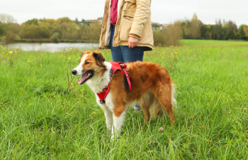 - Placez votre chien dans le harnais, en insérant ses pattes avant.